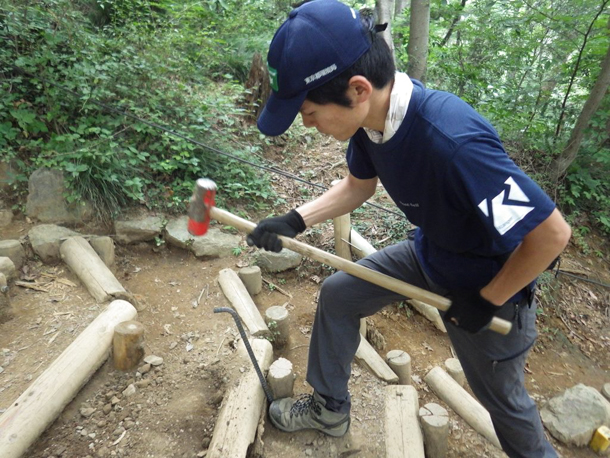 倒木の処理や登山道の修復もレンジャーの仕事。ハンマーや修復用の資材などはすべて背負って、現場に向かうことになる