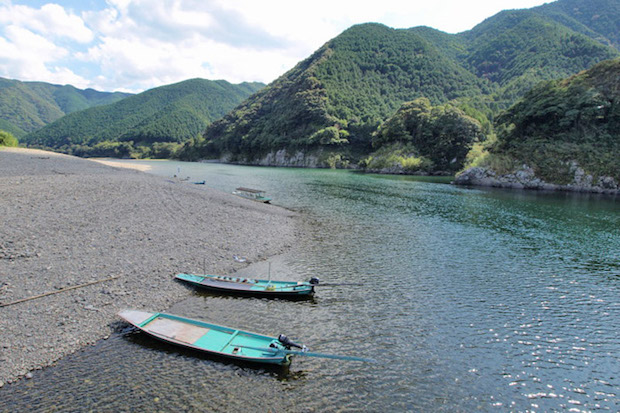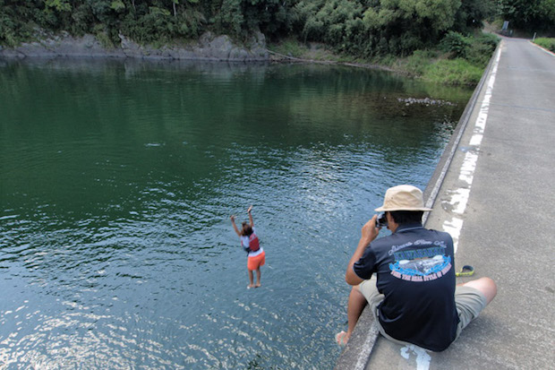 たとえばここ。四万十川の勝間沈下橋の下流側。沈下橋からの飛び込みスポットとして知られていますが、川辺の地元民は「飛び込むなら必ず救命胴衣を着けて」と願っているのです。つまり水難事故が大変多い場所だということ。