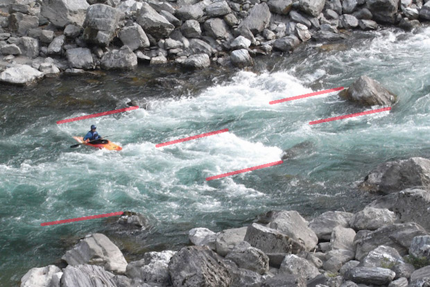 川の流れのなかに岩などの障害物があると、その岩の下流側には淀み(エディ)ができます。このエディと流れとの境界がエディライン(上、下写真の赤線)。