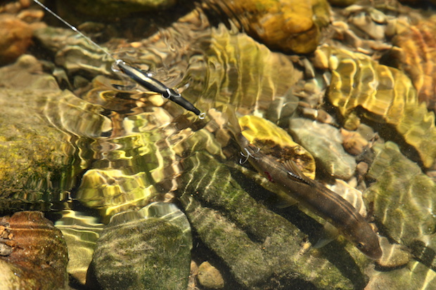 アユがいそうな岩場を舐めているうちにアユがヒット! 友釣りは縄張りを侵した個体を排除する性質を利用した釣りですが、アユのルアー釣りは釣り場が大アユのいないチャラ瀬なので、釣れるのはほとんどが縄張りをもてない小型です。縄張りをもてない小型は群れを作って群泳するのですが、群れになろうとルアーに寄るうちに鉤にひっかかるのかもしれません。
