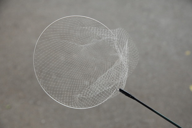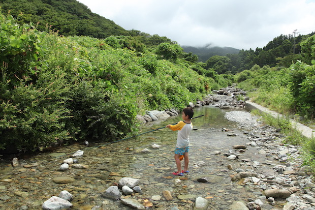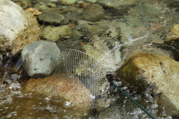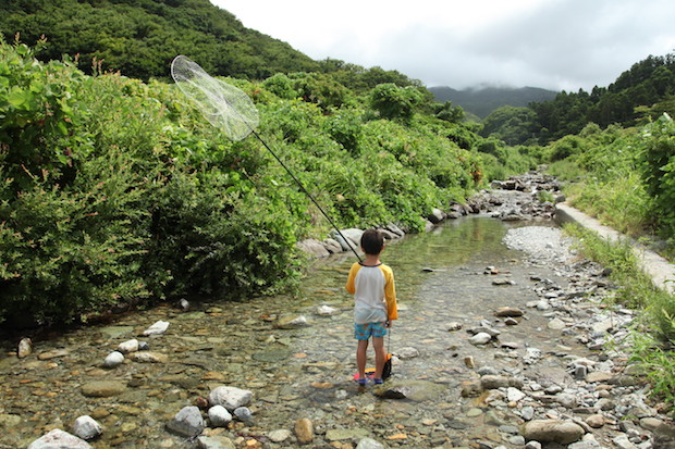 虫採りの回と同じく、使うアイテムは渓流竿にくっつけたエビたも。アユを獲るときは、径が15cm程度のものがおすすめです。