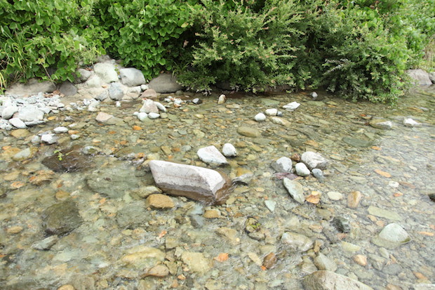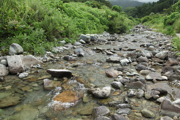 アユ獲りに適しているのは水深15cm程度の浅い瀬が続くこんな川。水深が20cm以上あるとエビたもで獲るのは難しくなります。