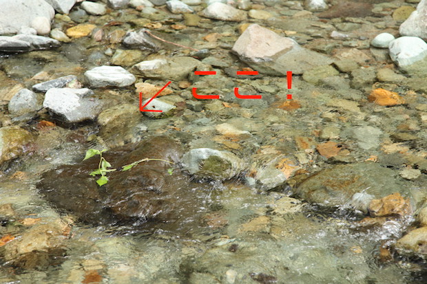 正解は画面左側、茶色い石の向こう側! 追われたアユは一度ヤナギの草陰に集結し、さらにプレッシャーをかけると、右岸側の岸沿いに下流側へと走り、茶色い岩の向こうから逃げようとします。