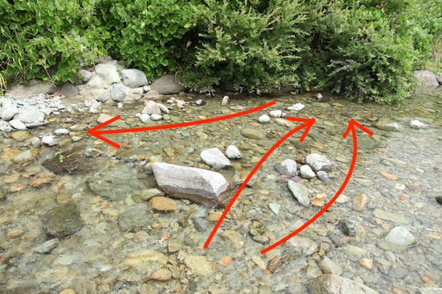 さて、ここで問題です。この瀬のアユを左岸側を歩いて上流側に追い上げたとき、反転したアユが通るのはどこでしょうか?