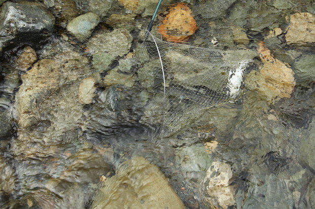 エビたもはこのようにして水路を遮ります。理想的には、渕尻から一段下がった場所にたもを置けると、泳いできたアユからたもが見えず、捕獲率が上がります。アユは非常に目が良いので、極細のエビたもを見破ることもしばしば。たもを置く水路の入り口に目隠しの岩を置いたりするのも効果的。