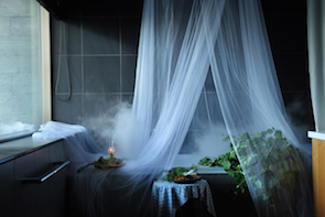 ■ハーブサウナ/開放的なキャビンのバスルームで、富士北麓のハーブの香りを全身で楽しむ。この温かさを楽しめるのも冬ならでは。寒さでこわばった身体がゆっくりほぐれていく、極上のリラックス感を味わってください