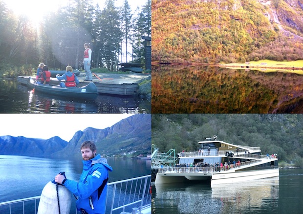 (左上)半日のフリータイムでも自然遊びを体験したベルゲン。自然までのアクセスがとても短いからこそ。(右上)世界遺産ネーロイフィヨルドを通るクルーズ。取材に訪れた10月上旬には黄葉が楽しめました。(右下)フィヨルドのクルーズ船は音もなくスーッと水面を進む最新鋭。ガソリンに頼らないハイブリッド船で、電力は水力発電を利用。(左下)イケメン船員さんも常務