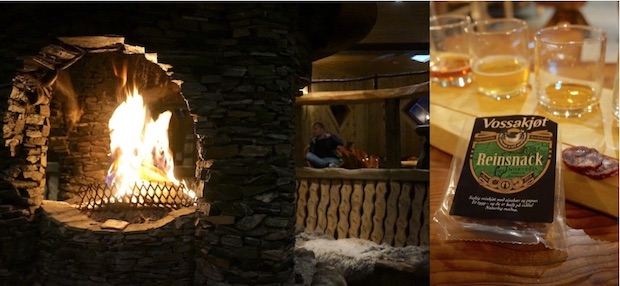 2日目の宿泊地フロムにはクラフトビール醸造所が併設するビアバー、Ægir BryggeriPub(エーグル・ブリッゲリパブ)があります。クラフトビールの飲み比べセットとトナカイ肉のサラミを注文。火を囲んで飲むお酒はなんでこんなにおいしいのでしょう