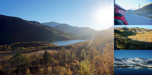 海抜2mのフィヨルド沿いの街フロムから標高863mのミュールダール駅をめざし、フロム鉄道で登っていきます。山岳鉄道の傑作と称賛される絶景。右上の写真は、フロム鉄道終点駅のミュールダール。ここで国鉄に乗り換えてオスロに向かいます。国鉄に乗り換えた後もすばらしい眺望が続きます。標高の高い場所は10月でも雪景色に