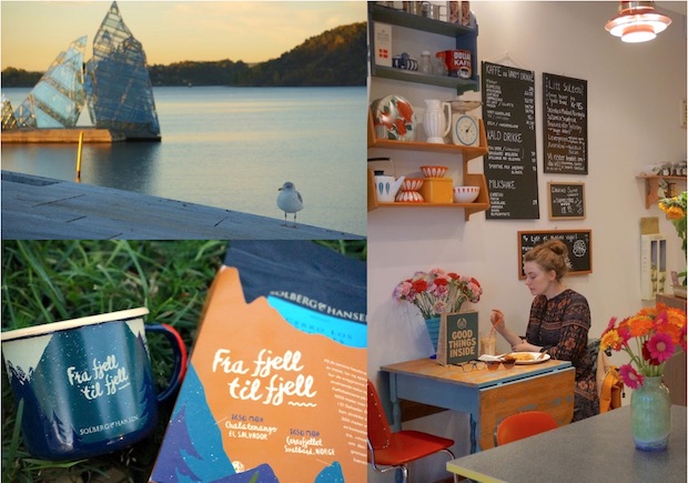 (右上)首都でありながらフィヨルドと森に囲まれた自然豊かな町であることを実感できた朝の散歩。(左)カフェ文化が発達したオスロにはおしゃれなカフェがたくさんあります。(左下)コーヒー豆専門店では「山から山へ」というコーヒーのシリーズを発見。山頂でコーヒーを淹れるのを楽しみに登るノルウェー人はとても多いそう。ホーローのマグカップとセットでおみやげに購入しましたー