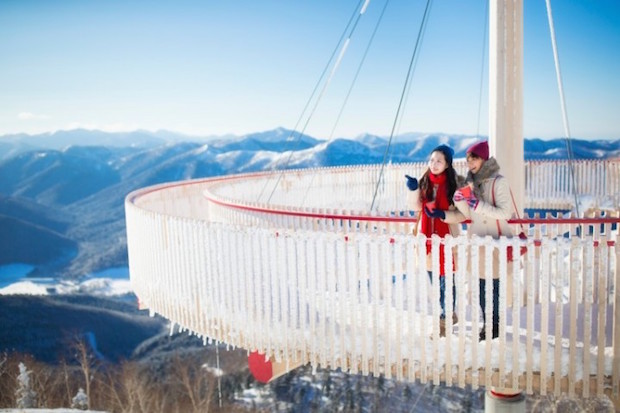 が、Akimama的にはこの「霧氷テラス」から徒歩5分の「クラウド・ウォーク」こそをめざしたいところです。空中に張り出したデッキには壁も屋根もありません。一切視界をじゃまするものがない中、空を飛んでいるかのような開放感と共に雪と氷と霧氷とが地平線まで広がる景色を眺めることができる。標高1000メートルオーバーで、こんなにもオープンエア。高いところと景色の良いところが大好きなAkimamaにとっては、ちょっと見逃せませんよ、というわけです。