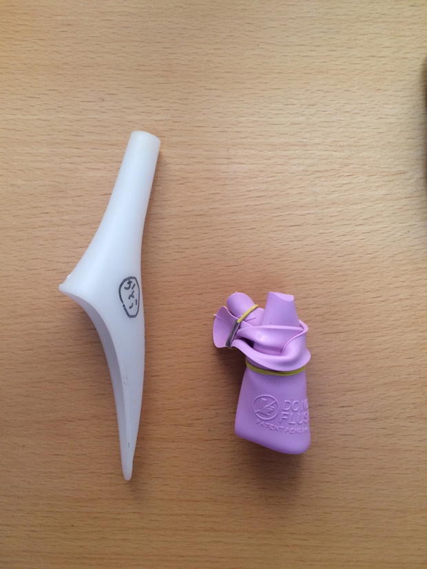 と立ち上がったわけですが、その前になるべくきれいなうち? にと、新旧を比べてみましました。左が以前私が愛用していた使用済み旧立ちショングッズ、右が最新の未使用の立ちショングッズ「GO GILR」であります。