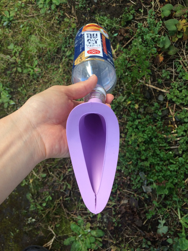 溜めるといえば、トイレにいけないけど、もー、がまんできないってときの秘策「ペットボトルにおしっこを」ですが、右くらい口の大きいペットボトル(直径約4㎝)だったらなにもなくてもなんとかおしっこできます。しかし、通常のペットボトル(直径約2㎝)ではダメです。どうがんばっても半分はこぼれちゃう。しかし「GO GILR」を使って試してみたら、一滴もこぼさずおしっこすることができました。