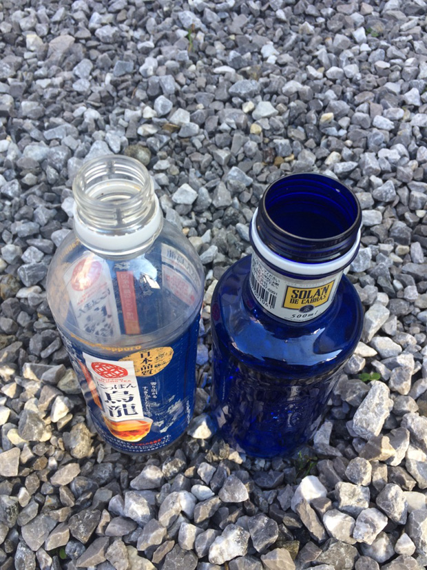 口の大きさの違うペットボトルの比較。大きなものなら立ちショングッズがなくてもOK。