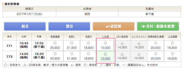 そしてこちら↓が2日後・10日の同じ路線。「いま得」は画面に表示がなく、最安値は「前割1」の14,590円です。(※この場合は他航空会社「エアドゥ」の「ドゥバリュー1」の方がお安い)