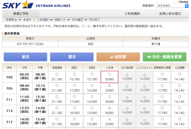 こちら↓が今回購入した3日後・11日発の「羽田ー新千歳」の「いま得」航空券。始発なので8,990円。安い!