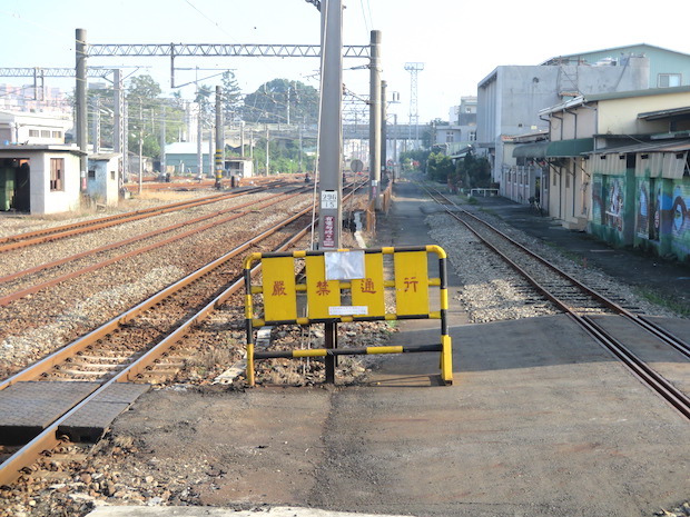 台鐡の線路(左)と阿里山森林鐡路の線路(右)の幅が、ぜんぜんちがう。幅1,067mmと762mm。阿里山のほうは、狭いからかすごく揺れた