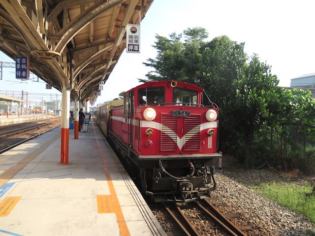 先頭の列車はレトロでかわいい赤いのだけど、お客さんが乗るのはベージュの車両。4両あって、わたしたちが乗るのは3号車。席は2+1の3列シートで全席指定。各車両にトイレ付き。いうなれば、田舎のローカル電車みたいな感じかな。始発の嘉義駅でほぼ満席の状態に。小さい子どもを連れた家族や若そうなカップルも大勢いた。
