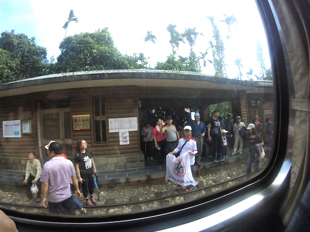 樟腦寮駅で、人がいっぱい乗ってきた。外の線路横を歩く人もいる。このあたりに台湾で有名な低山があるようだ。どうやら、登山の途中で阿里山森林鐡路も乗るルートとなっているみたい。