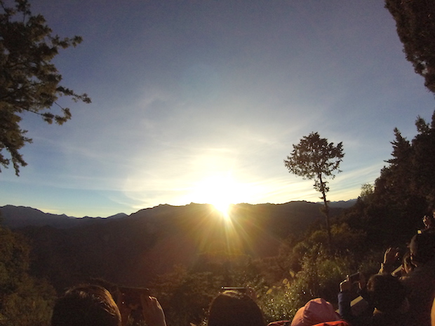 祝山から見える日の出は台湾最高峰の玉山方向から昇る。2本目の祝山線が到着して、さらに人がいっぱい。周りには、日本人はいなかった。日の出まで時間があったからか、駅前の売店のおじさんが登場して話し始めた。台湾の言葉はわからなかったけれど、たぶん、おじさんは阿里山や玉山の話をしていて、おもしろいのか、みんなが大笑いしていた。最終的には名産のヒノキオイル買ってねと言って、みんなの手のひらにお試しで塗っていく。なるほど、販売員のおじさまだったのね。私も塗ってもらったけど、癒し系の良い香りだった。