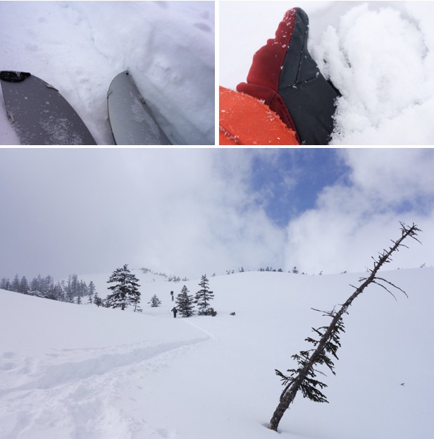 スプリットボードで歩いてみましたが、それでもこれだけ沈む新雪です。板を脱いで片足で立つと、45センチほど沈みました。降雪結晶は崩れていますが、時々キレイな六花も見られるほど。汚れはなく、板はよく走ります。3月10日は午後から晴れ間も見えましたが、日照はさほど強くありませんでした。南斜面の雪もまだまだ生き残っていますよ!
