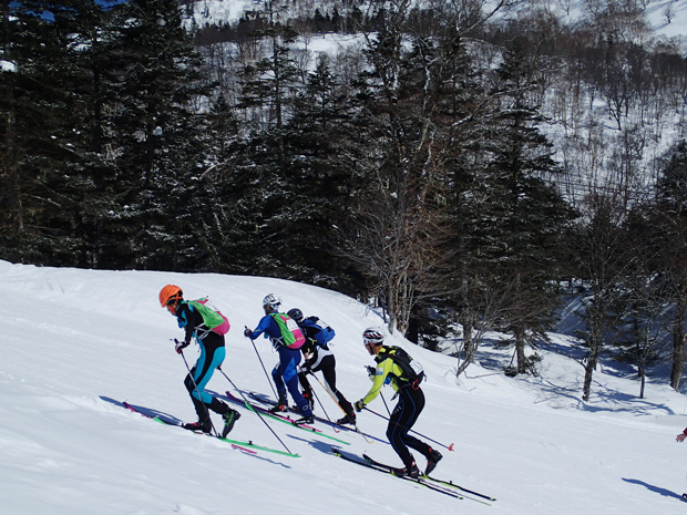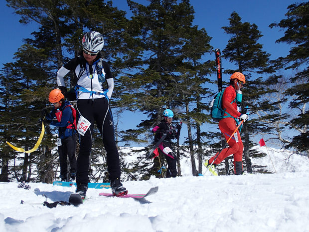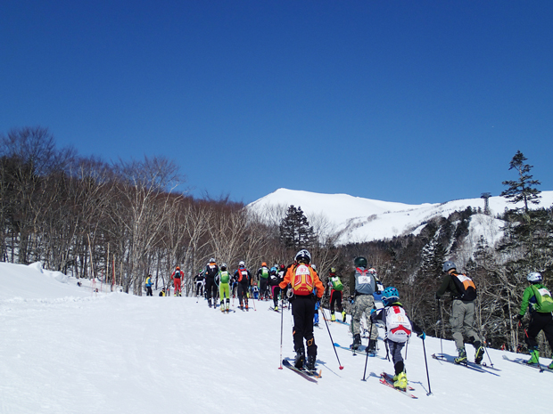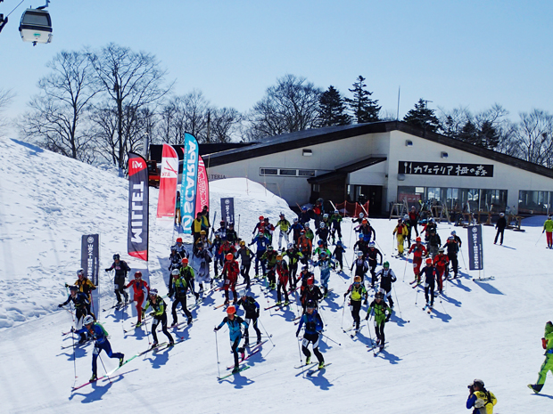 午前9時半。スタートラインにならんだ61名は緊張の面持ちでスタートの合図を待つ。「20秒前…」徐々にカウントダウンされていき、パーンッ!いっせいに走り出した。シューッ、シューッと、スキー場らしからぬ音があたりに響く。まずはシールを着けての登りだ。トップで飛び出したのは日本代表としても世界大会に出場している選手たち。そして、後尾には初出場の選手の姿もあり、一団は徐々に長細い列へと伸びていった。