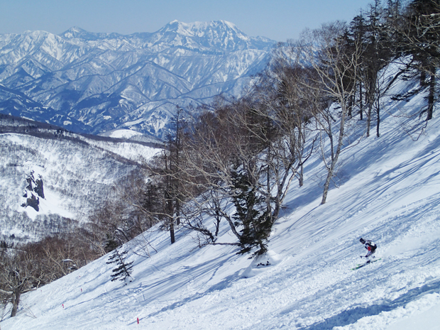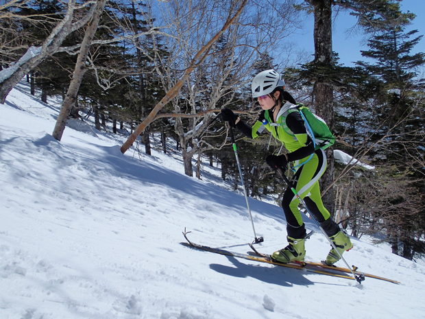 レース当日の雪のコンディションは、かため。登りではシールが利きにくい箇所も多数あり、全体的に滑りにくいコンディションだった。しかし上を見上げれば雲ひとつ無い青空に、遠くの峰々も見えて眺めは爽快。登りの苦しさから解放され滑走区間に入った選手たちの「ホーッ!」という雄叫びが上がっていた。