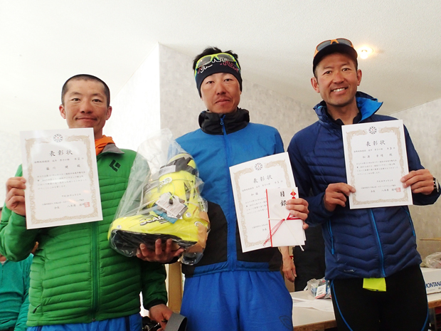 成年男子で優勝した加藤淳一選手(中央)、2位の藤川健選手(左)、3位の松澤幸靖選手(右)。