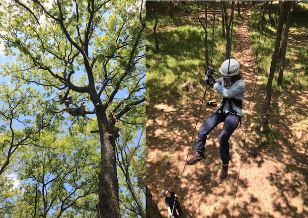 童心にかえるとはこのことで、もはや樹木の枝と化した参加者たち。黙々とロープを繰り出していると、アッという間に木のてっぺんに着いてしまう。それほど、わかりやすい