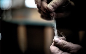 直接見ることはできませんが、メリノウールがいかに細い繊維でできているか、というイメージだけは伝わると思います。綿あめよりも柔らかく、はかない見た目ですが、繊維自体はとても丈夫。羊毛をピンと引っ張って弾くと、楽器の弦のように振動するほどです