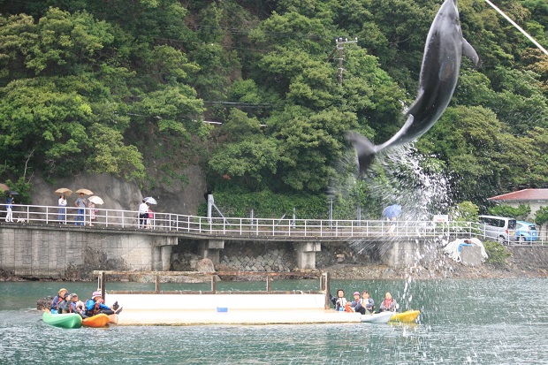 追いかけっこを楽しんでいたら、イルカのショーの時間になりました。カヤックに乗って同じ水面の高さから見る、ここは特等席。思わず見上げてしまうジャンプや、トレーナーと息のあったドルフィンサーフィンなど、迫力満点のステージが楽しめます。