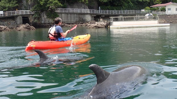カヤックとパドルなどを貸してもらい(道具や水族館入館料はツアー費に込み)、入り江の前で記念撮影をしていると、遠藤さんがイルカを呼んでいます。