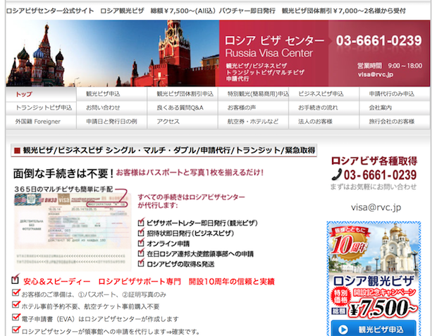 これが代行業者のサイト「ロシアビザセンター」。ここだとバウチャー入手からビザ取得まですべての手続きを日本語で対応してくれる。