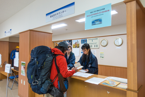 パスポートを差し出すと、あっさり出国スタンプを押してくれた。床に引かれた白線を越えると、国境の向こう側にいたオジサンが「こっちこっち!」と手招きしている。この人が稚内とコルサコフを結ぶ「サハリン海洋汽船」の係員さんらしい。