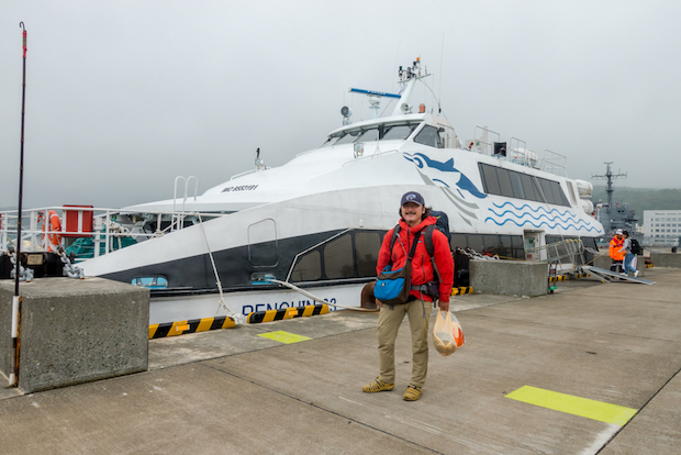稚内港の埠頭にスタンバイする『ペンギン33』号。とても国際定期航路の船とは思えないサイズ感。せっかくセイコーマートでお弁当買ってきたのに、揺れるなら食べられそうにないなあ