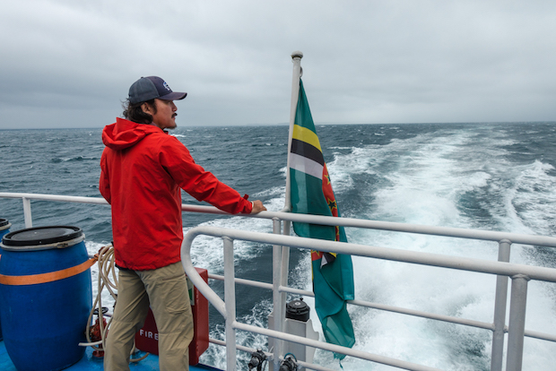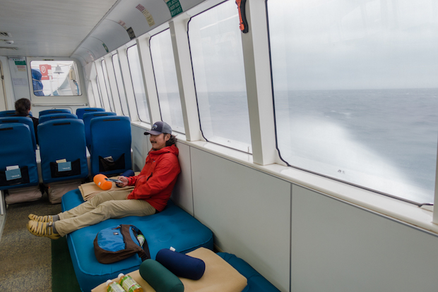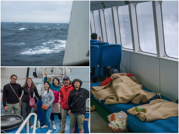 今回の乗船はわずか6人。しかも全員が個人旅行者という珍しい状況になった。右端の黒いジャケットが田島継二くんだ。外洋に出ると海はいよいよ大荒れ。船内に用意されたエアベッドに倒れ込み、全員沈没
