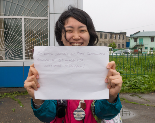 「いいかいお嬢さん、これには“ユジノサハリンスク行きのバスはどこで乗れますか?”って書いてあるから、向こうについたら誰かに見せて教えてもらうんだよ。それから山登りのお兄さんたち、もしよかったらユジノまで一緒にいってあげてよ」