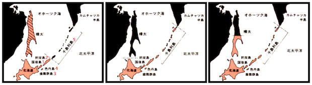 左)1855年の「日露通交条約」では樺太の領有権を設けず、日露両国民雑居の地としていた。中)1875年の「樺太・千島交換条約」によって樺太全島がロシア領となり、以後流刑地として使われた。右)1905年の「ポーツマス条約」により北緯50度以南の南樺太が日本の領地として復帰した(出典=全国樺太連盟より)