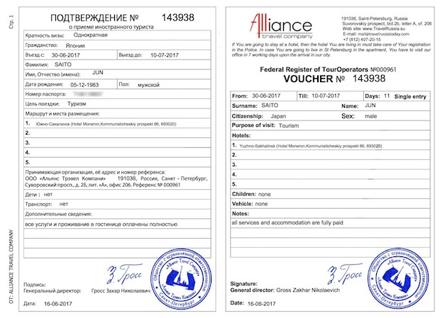 僕の旅行計画はパッケージツアーではなく個人で組み立てたため、当初は行きの船舶(ネットで予約し、銀行振込み)、帰りの飛行機(電話とメールで予約し、請求書対応の銀行振込み)、ユジノサハリンスクのホテル(booking.comで予約し、現地で現金支払い)などの個々の領収書や予約確認書に加え、セルゲイさんの会社「ADRENALINE TOUR」に受け入れ確認書を作って貰おうとしたのだが、この書類はロシア連邦観光省による登録業者(旅行リファレンス番号を持つ受け入れ機関)が作成し、なおかつ署名と社印が必要なため、個人ガイドのセルゲイさんでは対応できず(というか、ロシア語ができない僕のコミュニケーション能力不足により、そこまで細かくネゴシエーションができなかった)、けっきょく途中で頓挫してしまった。