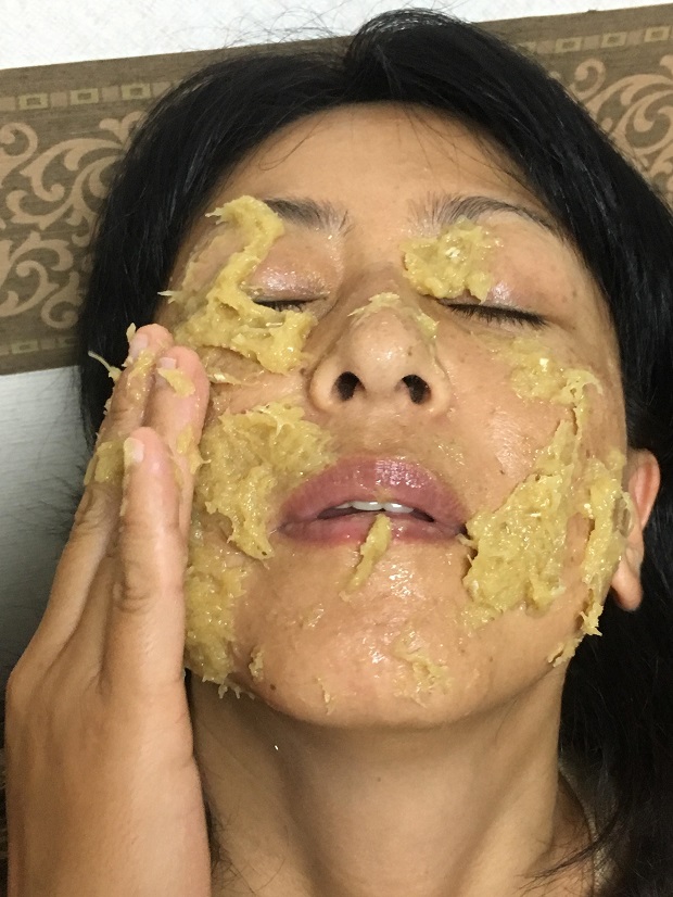 最後にテングサを煮溶かしたら、ふきんなどで絞って「ところてん液」を作ります。その搾りかすで、顔面をパックしてみました。効きそう!気持ちいい。 「かっ、快感……♡」(注・肌の弱い方は真似をしないほうがいいかもしれません)