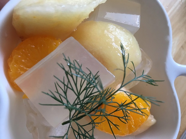 そして「ところてん」は、味付けに地域差があることでも有名です。関東以北や全国では酢醤油、関西は黒蜜、四国は出汁で食べるところもあるそうです。関西人の私は、蜜豆を作ってみました。「おいしい~」旬の桃をたっぷり使って、いろいろなデザートを作ります。