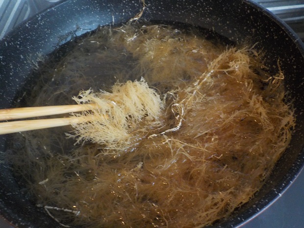 そして、天草を水洗いして、鍋に水、テングサ、酢を加えて火にかけて、40分ほど煮込みます。酢を入れるなんて知りませんでした。