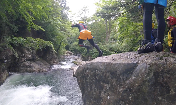 装備を着用したら車でコースまで移動。下車地点から少し歩いた後、スタート地点の渓谷まで下っていきます。スタートはいきなり高低差6mの大岩から滝壺へのダイブ? マヂっすか?! いきなりサブガイドの方がお手本ダイブ。