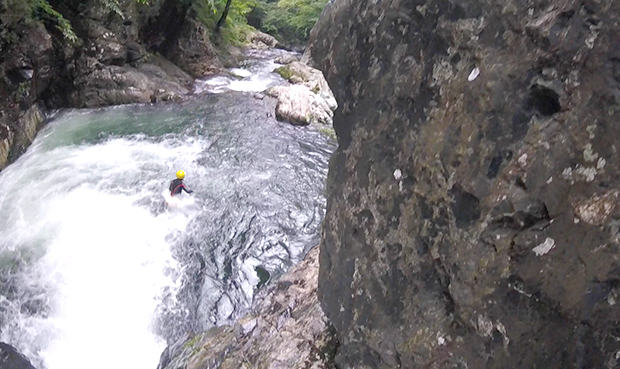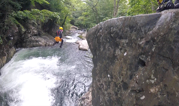 こ~え~。でもそれに続いて、参加者の方々も次々と飛んでいきます。で、自分の番。大岩の縁に立つと想像以上に高いです。ドキドキ感MAX。