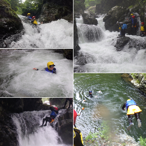 その後は、滝のスライダーを滑ったり、ターザンみたいにロープジャンプしたり、滝の裏側に入ったり、3mぐらいのミニダイブしたりと遊び倒します。水温は18℃ぐらいで、結構冷たいのですが、動いてカラダがポカポカしてるせいか、この水の冷たさも心地いい。また激流に揉まれるのも楽しいですが、トロいところでプカプカ浮いてるのも気持ちいいのです。プカプカしながら水面から上を見上げると左右から迫ってくる木々とその隙間から見える空も美しくて、ずーっとこうして浮かんでいたいとすら思ってしまいました。