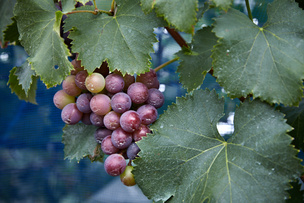 リンゴやブドウが間もなく旬を迎える果樹園の中を通り河川敷へ。これらの果樹は信越自然郷の名産品だ。