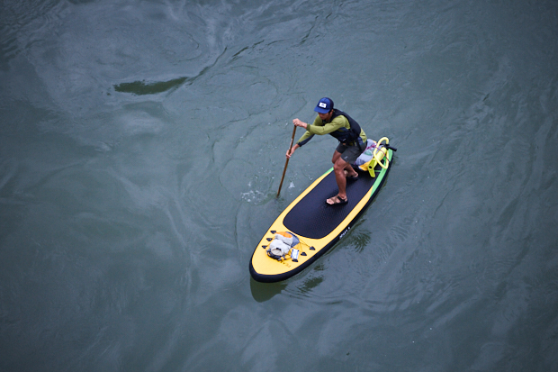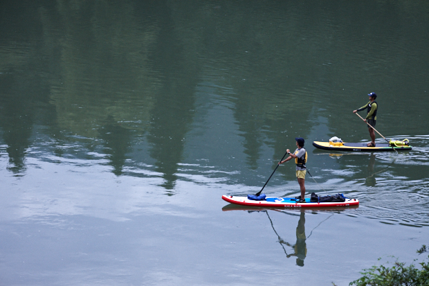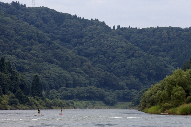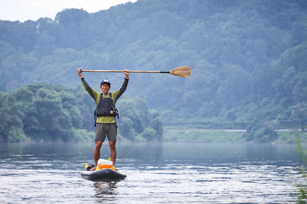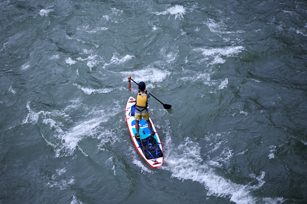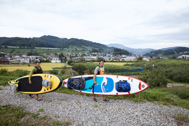 インフレータブル式のSUPはこうして片手で軽々持てる。さらに空気を抜いてクルクル丸めればコンパクトに収納できる。公共交通機関を使っての川旅にもってこいの移動手段だ。風は南から吹いていた。つまり追い風だ。風に背中を押され、SUPを川面に浮かべると、われわれはまさに水を得た魚のように下流へと飛んでいった。
