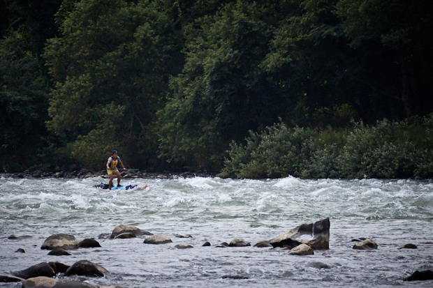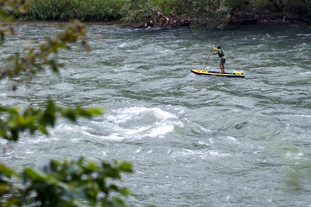 古牧橋下の瀬を漕ぐ著者、森山。体とSUPを結ぶリーシュは必須アイテム。リバーツーリングでは、すぐに外せるよう腰にクイックリリース機能のついたモデルが推奨される。このあと横からの流れをうけてSUPが傾き、ついに座ってしまった。屈辱のSDP(シット・ダウン・パドル)である。