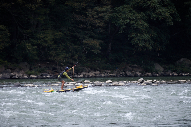ツーリング後、職場の飯山駅へ戻るため「沈だけはしたくない」と意気込み、湯滝の瀬へつっこむ浅野慧さん。さすがスキーもMTBもトレランもこなすアスリート。バランス感覚がすばらしい。