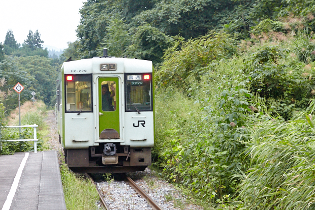 飯山線は単線で、かつ電化されていないディーゼル車両。時間によっては4両の場合もあるが、長野・飯山は基本2両。戸狩から先は、2両または1両で運行する。